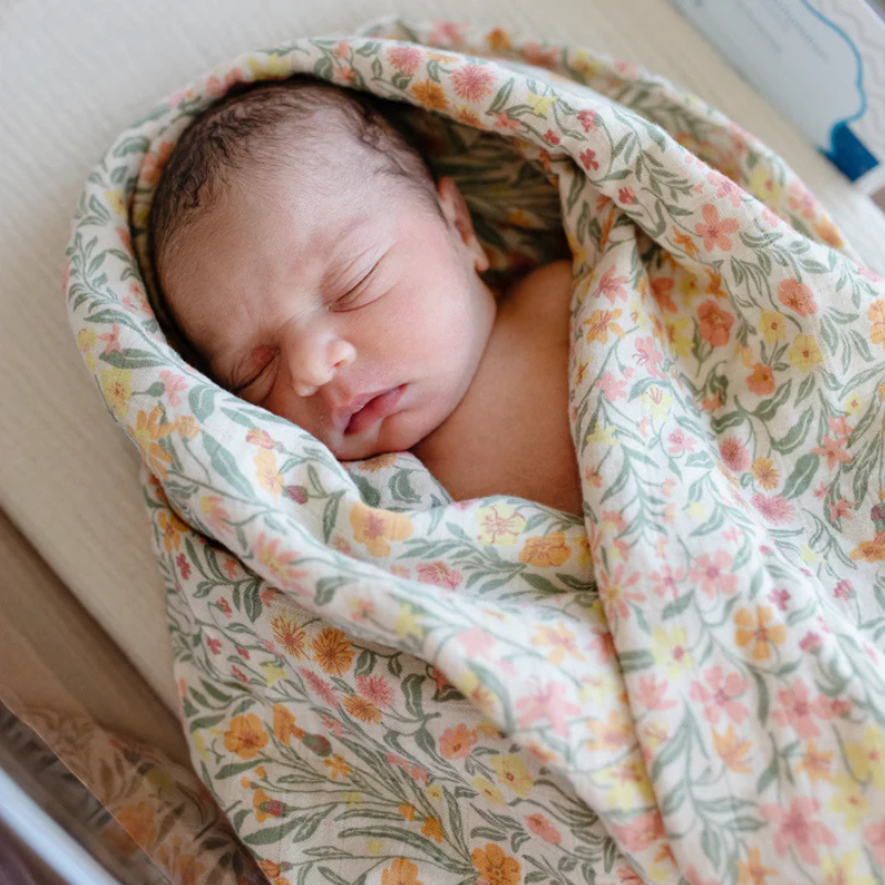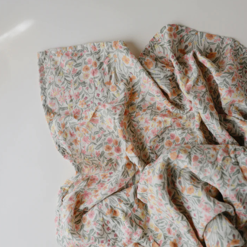 Pano musselina 120x120cm em algodão orgânico, padrão Pastel Blooms. Extra suave, respirável e ideal para envolver, amamentar ou como manta de brincadeira.