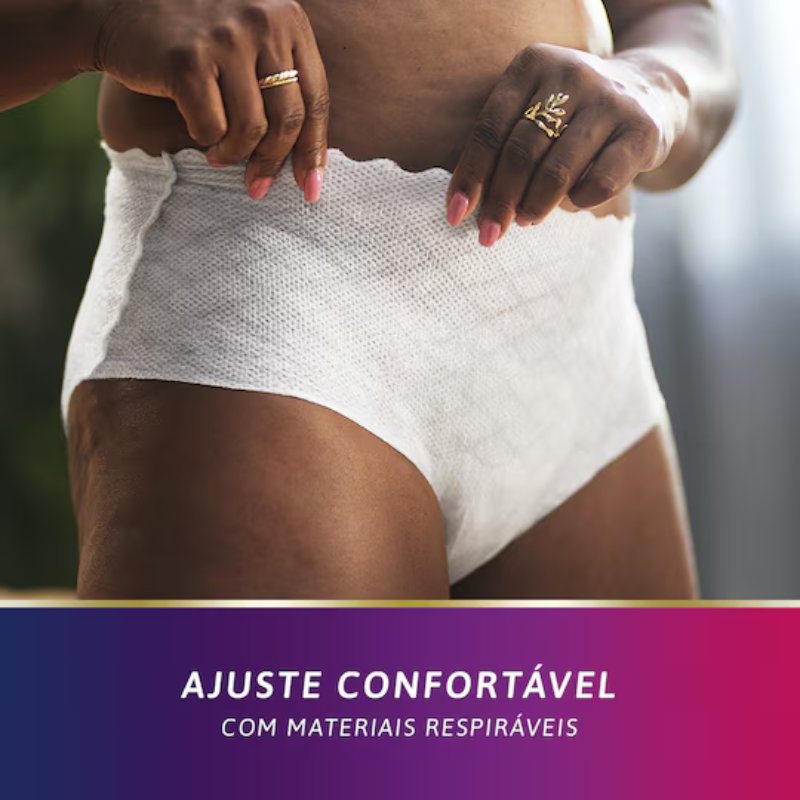 Tripla proteção: Combate perdas de urina, odores e humidade, mantendo-se seca e segura durante o dia.