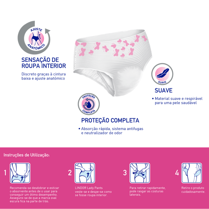 As cuecas femininas absorventes Lindor Lady Pants Cuecas L 7 Gotas concebidas para perdas de urina moderadas a severas, oferecem proteção total proporcionada pela rápida absorção, pelo sistema de barreira antifugas e neutralizador de odores.