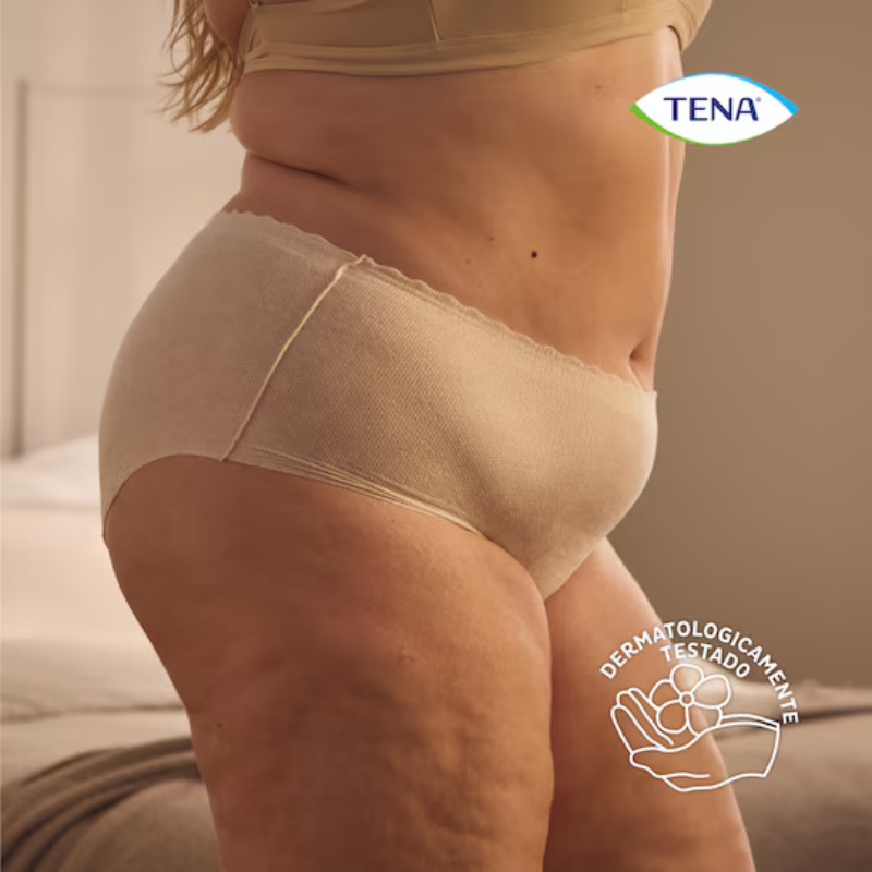 TENA Silhouette Creme Plus L: cueca de cintura alta para incontinência moderada a grave, com design feminino, tecido suave e núcleo absorvente Plus. Embalagem com 8 unidades.