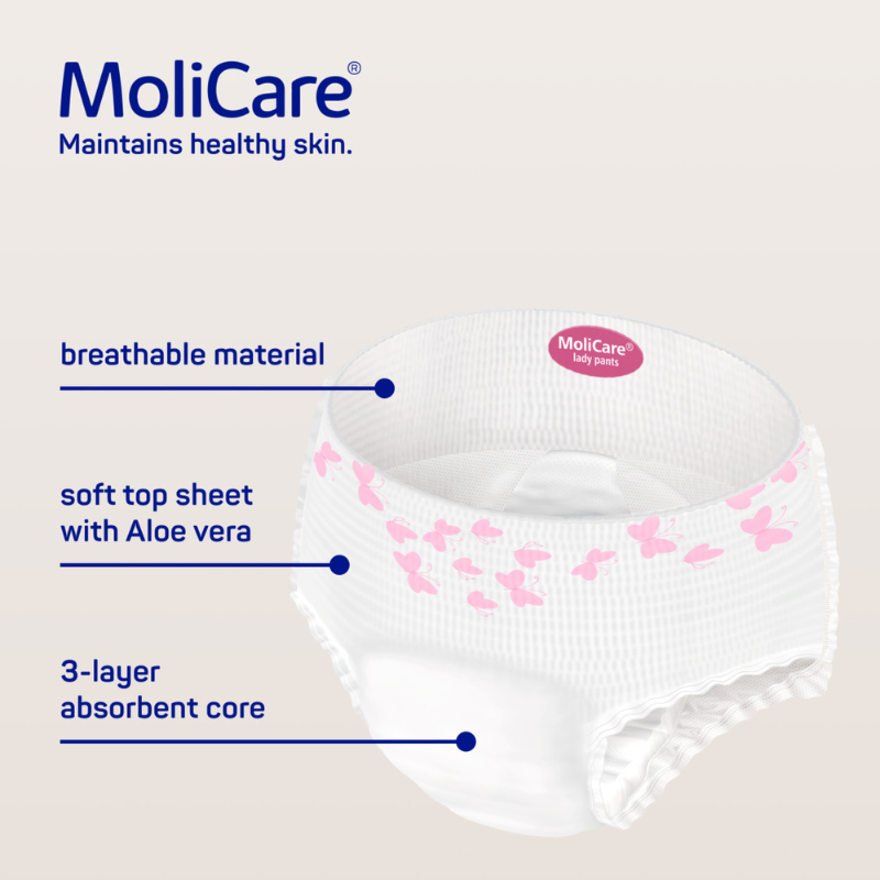 As cuecas para senhora Molicare Lady Pants Cuecas L com formato anatómico, proporcionam uma proteção segura enquanto mantém a pele saudável, com capacidade de absorção de 7 gotas.