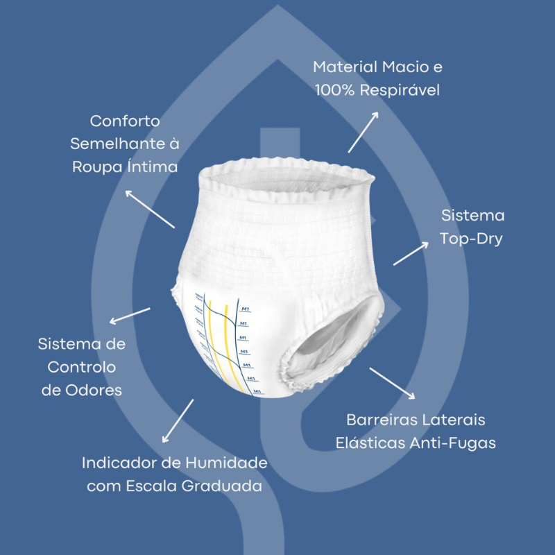 As Abena Pants Premium M1 são fraldas cueca descartáveis, concebidas para pessoas com incontinência moderada, proporcionando conforto e proteção tanto durante o dia como à noite.