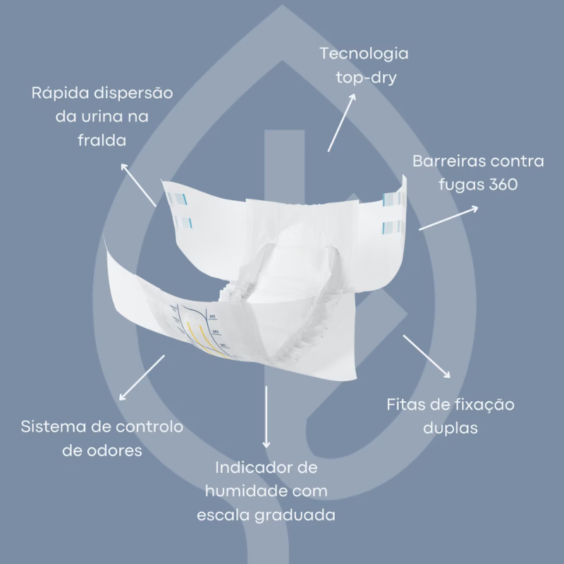 Tecnologia Top Dry: Absorve rapidamente a urina, mantendo a pele seca mesmo após várias micções.