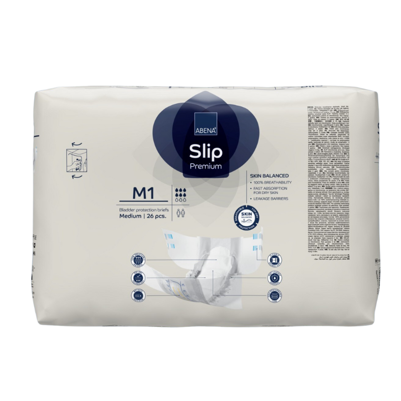 Fraldas Abena Slip Premium M1 para incontinência moderada a grave. Conforto respirável, absorção rápida e barreiras anti-fugas. 26 unidades.