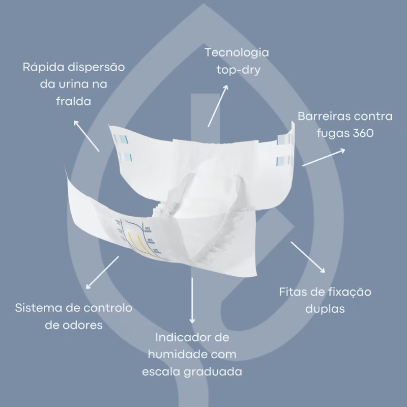 Indicador de humidade com escala graduada: Permite saber quando a fralda está saturada e pronta para ser trocada.