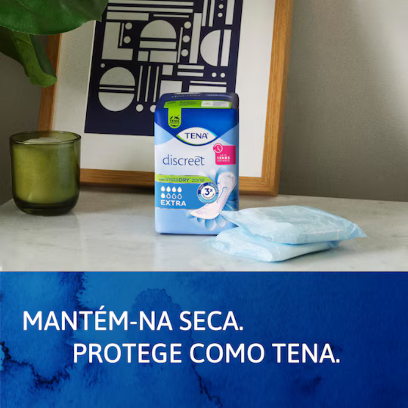 TENA Lady Discreet Extra é um penso feminino para perdas urinárias moderadas com zona InstaDRY™, tripla proteção e ajuste anatómico. Conforto, segurança e discrição.