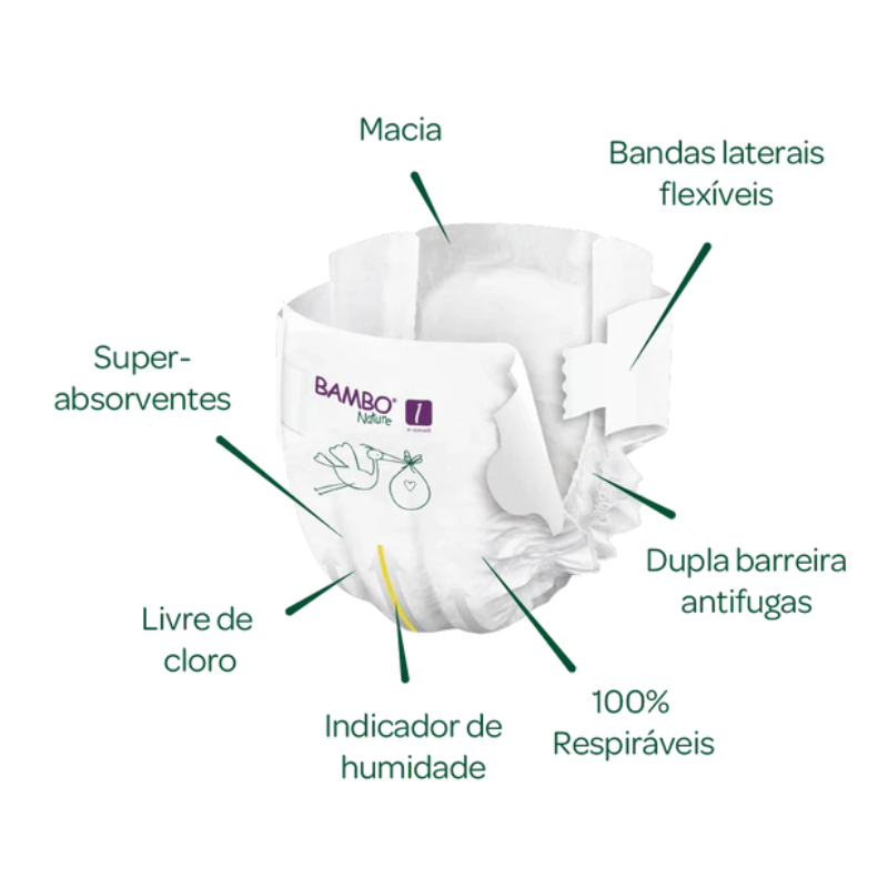 As Fraldas Bambo Nature 1 são macias, confortáveis e ultra absorventes, adequadas para bebés entre os 2 e os 4 quilos.