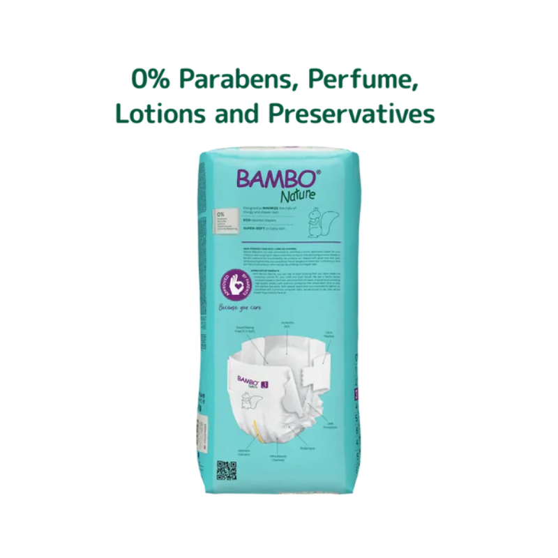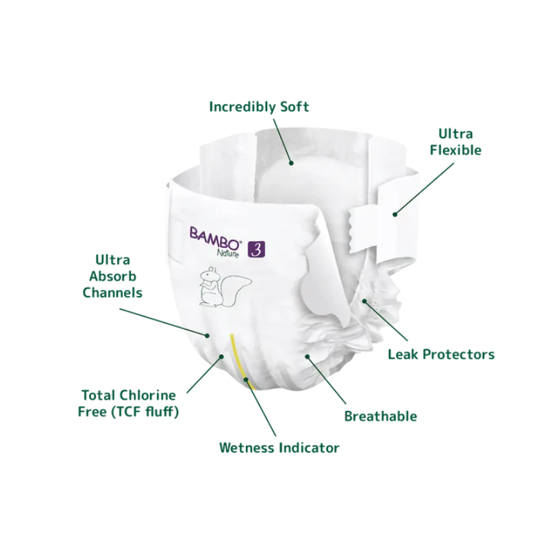 As Fraldas Bambo Nature 3 são macias, ultraabsorventes e ideais para bebés entre 4 e 8 kg. Com indicador de humidade que muda de cor, facilitam a troca. A cintura flexível e o ajuste perfeito garantem conforto e liberdade de movimentos.