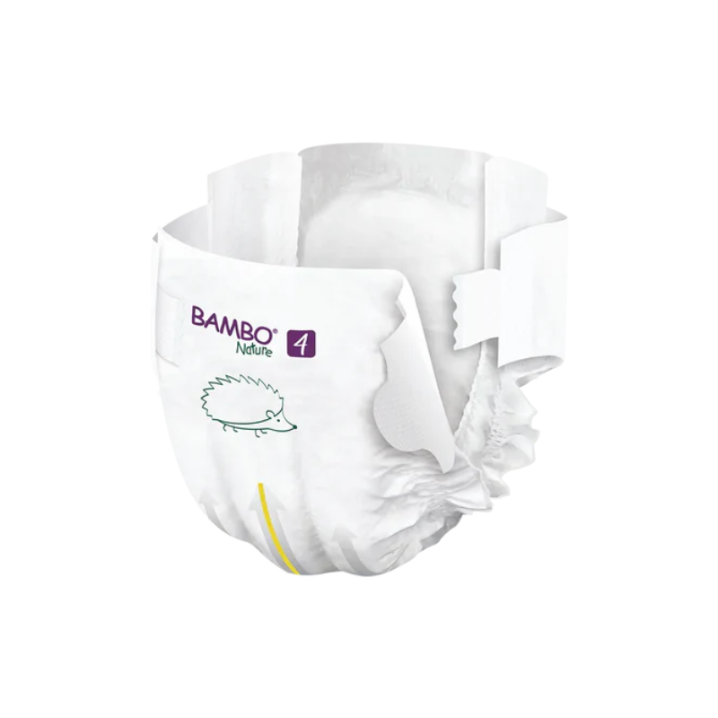 As Fraldas Bambo Nature 4 para bebés de 7 a 14 kg garantem pele seca e confortável, graças ao enchimento superabsorvente e à tecnologia de canais que afasta a humidade. O indicador de humidade facilita a troca, enquanto a cintura flexível e o ajuste perfeito proporcionam liberdade de movimentos para o bebé.