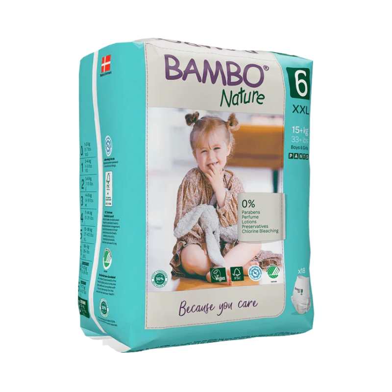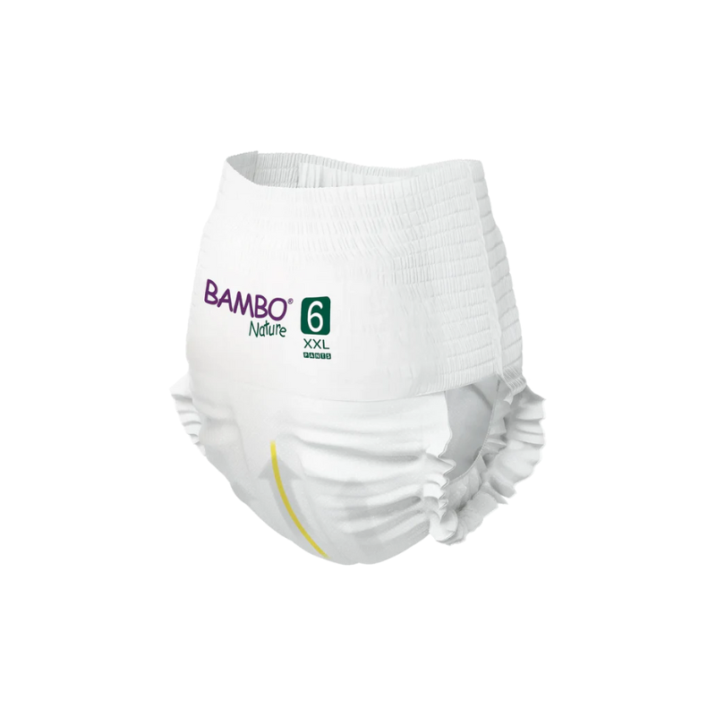 As Fraldas-Cueca Bambo Nature 6 são perfeitas para crianças com mais de 18 quilos. Fáceis de puxar para cima e para baixo, são ideais para o treino de bacio, ajudando as crianças a aprenderem a usar o vaso sanitário com mais autonomia.