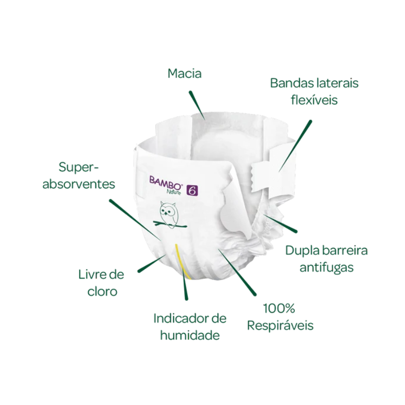 As Fraldas Bambo Nature 6 para bebés com mais de 16 kg garantem pele seca e confortável, graças ao enchimento superabsorvente e à tecnologia de canais que afasta a humidade. O indicador de humidade facilita a troca, enquanto a cintura flexível e o ajuste perfeito proporcionam liberdade de movimentos para o bebé.