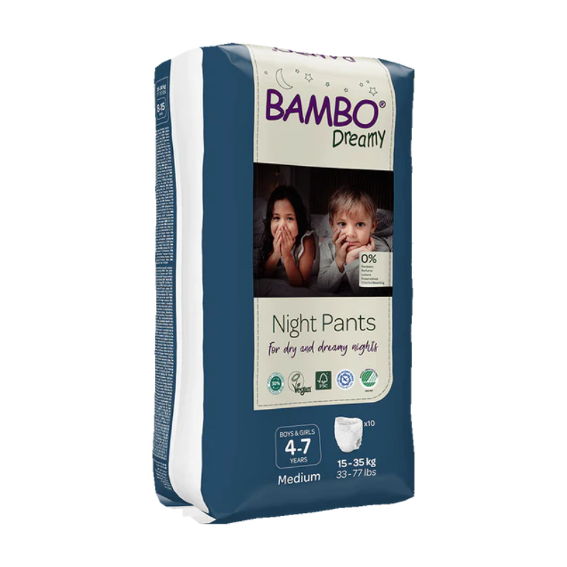 As Fraldas Cueca Dreamy Bambo Nature, ideais para crianças com enurese noturna, oferecem excelente ajuste, segurança e conforto para crianças entre 15 e 35 kg. Com um design discreto e confortável, elas mantêm a criança e a cama secas durante toda a noite, garantindo um sono tranquilo e sem preocupações.