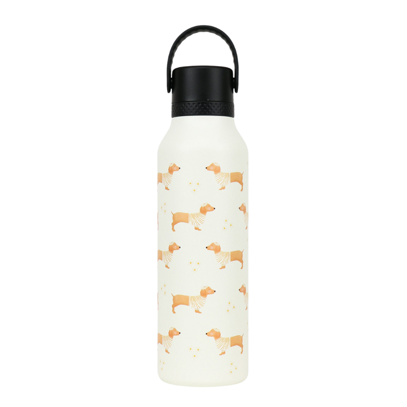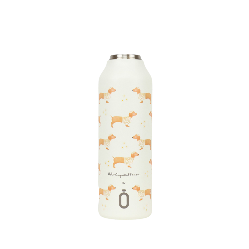 Com design exclusivo da ilustradora Carla Calvo, esta garrafa térmica de 600ml apresenta adoráveis dachshunds (teckels) em tons suaves. Fabricada em aço inoxidável 304 com revestimento cerâmico, mantém as bebidas frias por até 32 horas e quentes por até 24 horas.