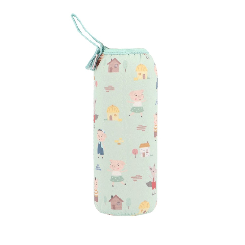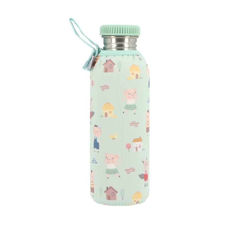 Tutete Garrafa com Forro Três Porquinhos fabricada em aço inoxidável com capa de neoprene. Ideal para escola, passeios e atividades. Resistente, segura, sem BPA e com fecho hermético. A partir dos 6 anos.