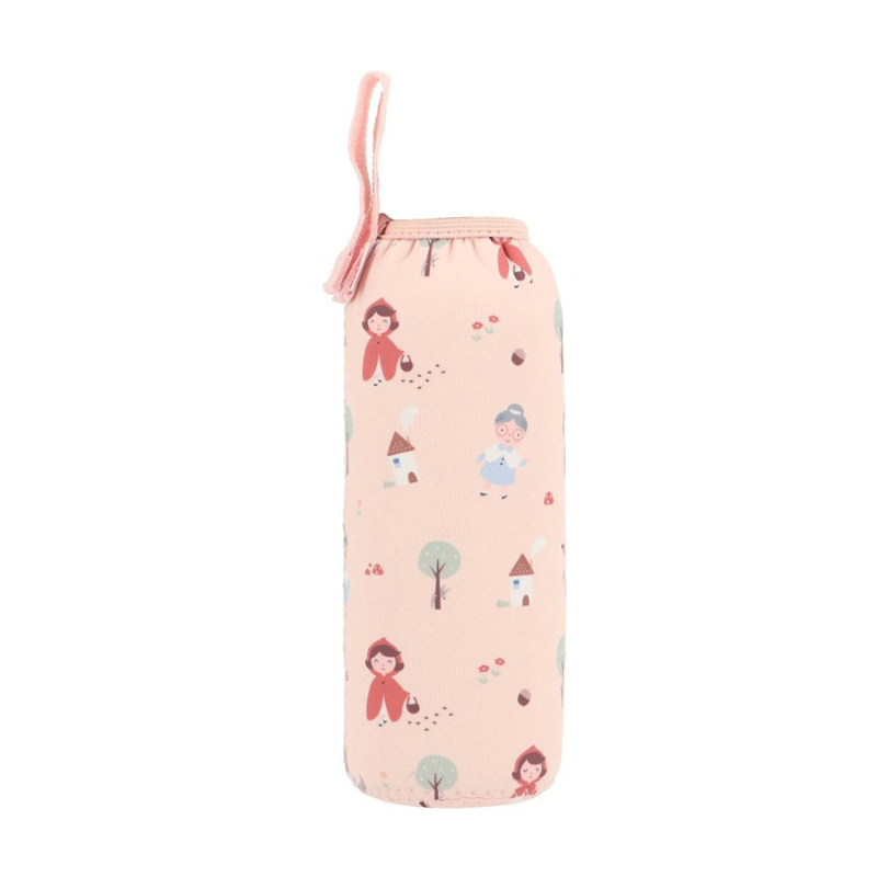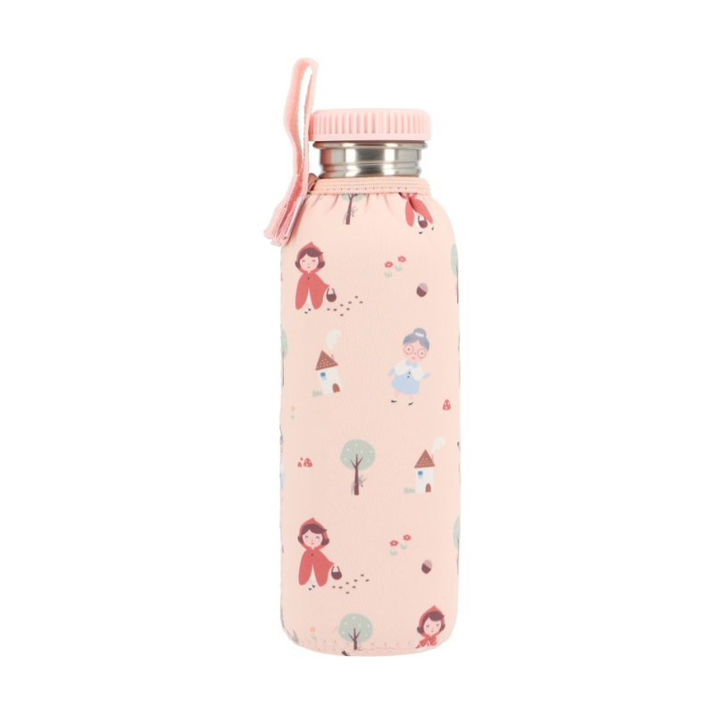 Garrafa infantil Tutete em aço inoxidável com capa de neoprene da coleção Capuchinho Vermelho. Capacidade de 750 ml, resistente, leve e personalizável. Ideal para escola e passeios. Sem BPA. A partir dos 6 anos.