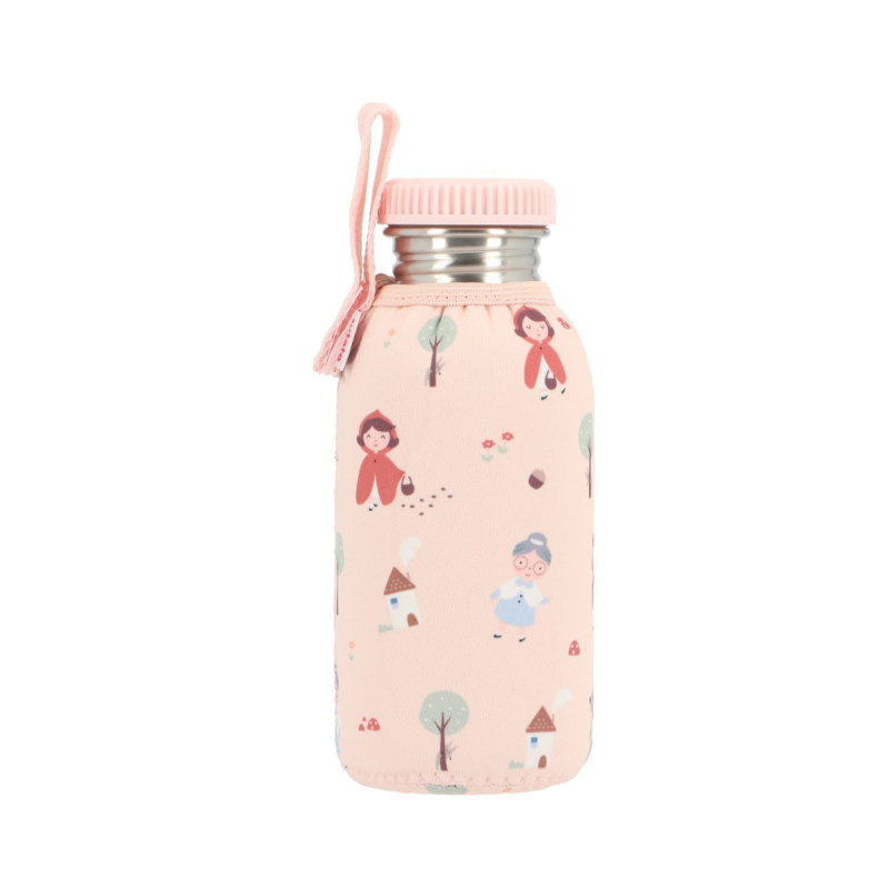 Garrafa infantil Tutete em aço inoxidável com capa de neoprene da coleção Capuchinho Vermelho. Capacidade de 500 ml, resistente, leve e personalizável. Ideal para escola e passeios. Sem BPA. A partir dos 6 anos.