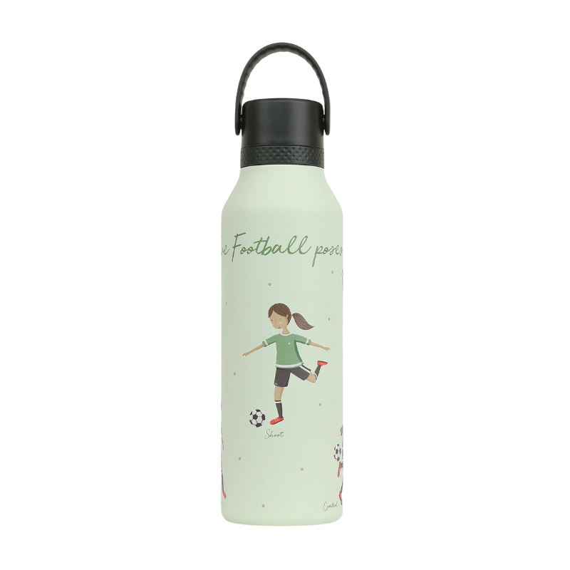 Garrafa térmica de alta performance com ilustração exclusiva de futebol! Tampa com bocal oculto regulável. Mantém frio 32h e quente 24h. Tecnologias Evertaste® (sem sabor metálico) e Microshield® (antibacteriana). Sem condensação.
