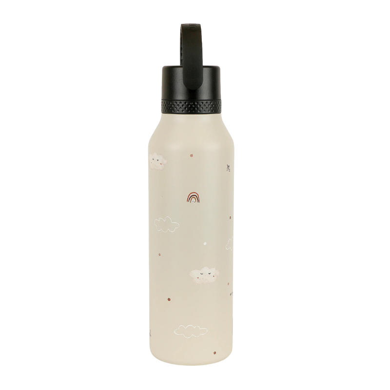 Garrafa térmica de alta performance com ilustração exclusiva de safari e nuvens. Tampa com bocal oculto regulável. Mantém frio 32h e quente 24h. Tecnologias Evertaste® (sem sabor metálico) e Microshield® (antibacteriana). Sem condensação.