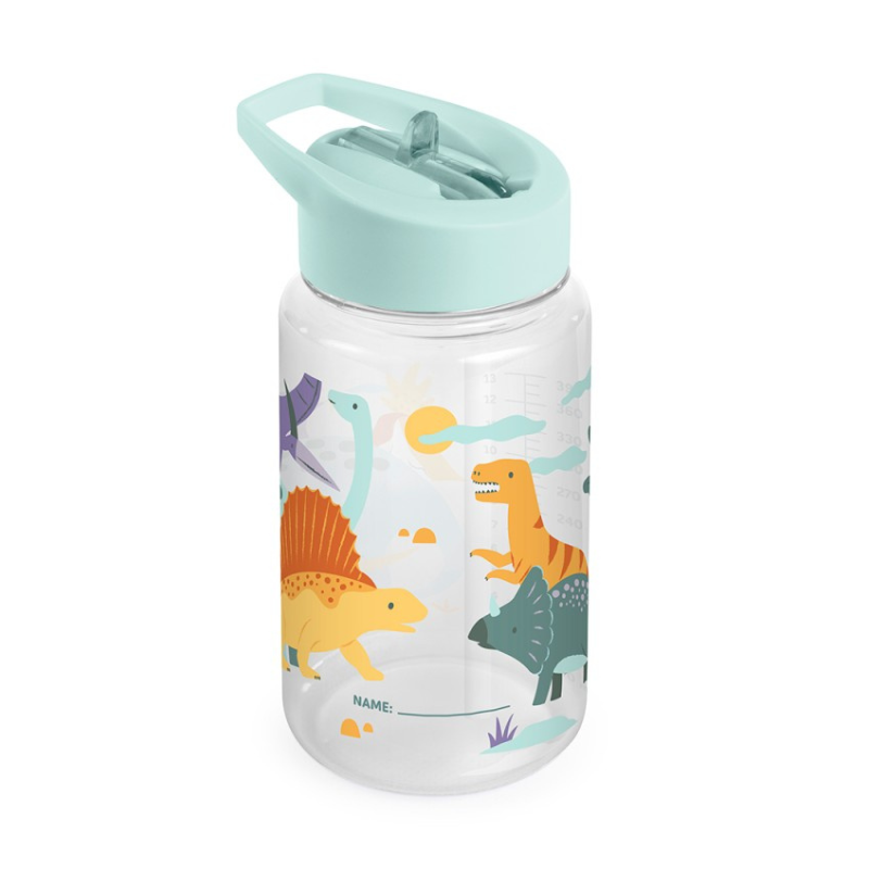 Garrafa Miniland Jurassic Kiddie Bottle em Tritan™, material de alta resistência a quedas. Capacidade 450ml, com palhinha rígida, pega ergonómica e escala de medição. Personalizável com nome. Fácil de desmontar e lavável na loiça. Design dinossauros.
