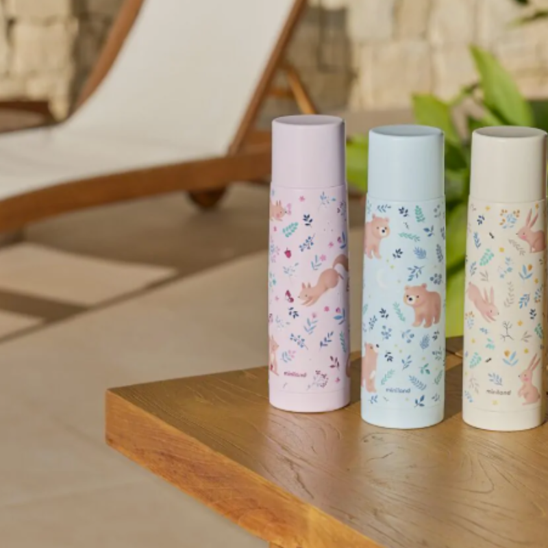 Garrafa térmica Miniland Thermy 500ml (design esquilo). Tecnologia de tripla camada que mantém líquidos quentes/frios por +24h. Sistema push-button à prova de fugas e fácil de servir. Aço inoxidável, livre de BPA. Ideal para as bebidas do bebé em qualquer lugar.