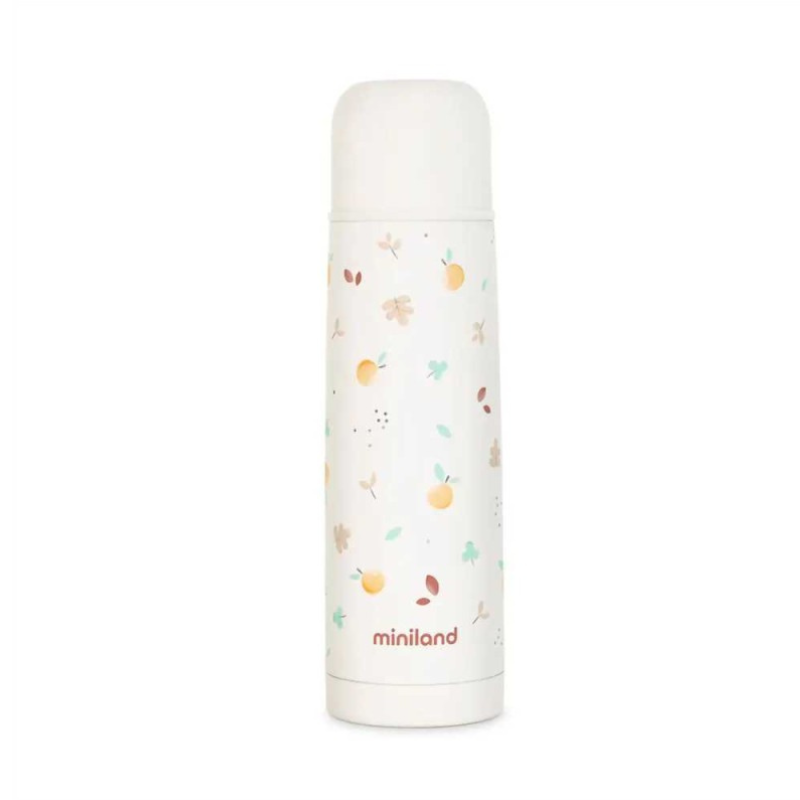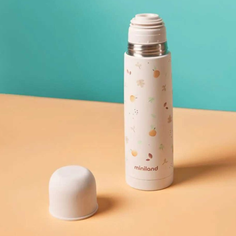 Garrafa térmica Miniland Valencia 500ml (design flores). Tecnologia de tripla camada que mantém líquidos quentes/frios por +24h. Sistema push-button à prova de fugas e fácil de servir. Aço inoxidável, livre de BPA. Ideal para as bebidas do bebé em qualquer lugar.