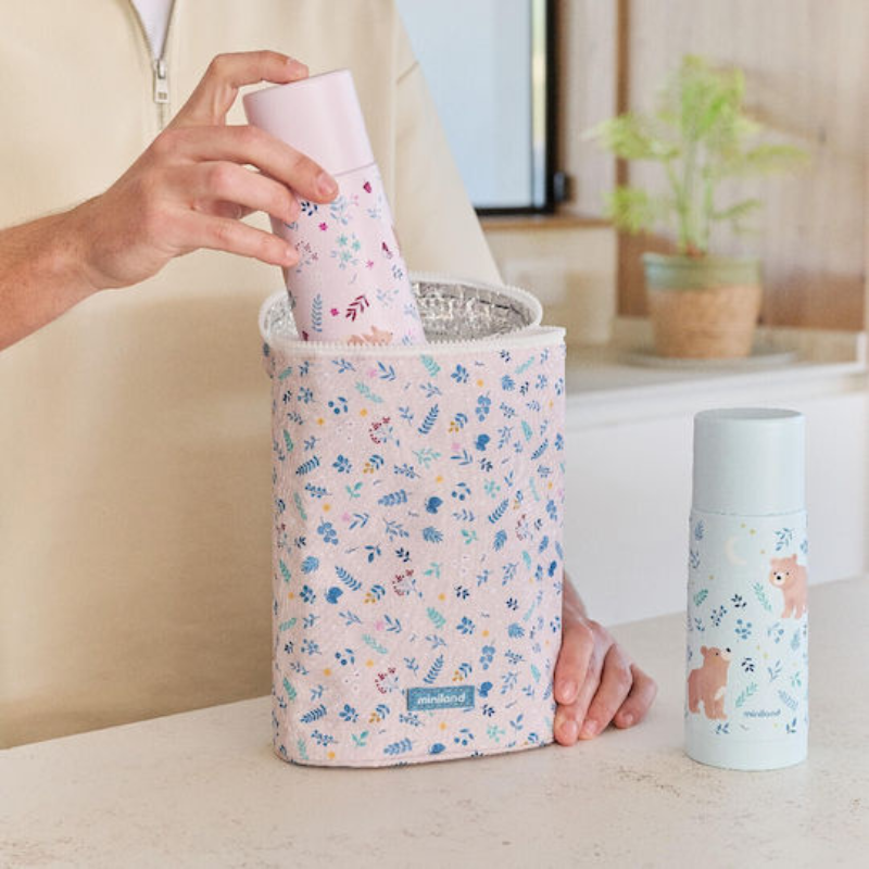 Saco isotérmico Miniland Thermibag para termos de sólidos até 350ml. Proporciona isolamento térmico extra, protege contra choques e tem compartimento para babador/talheres. Abertura superior fácil. Alça para pendurar. Ideal para passeios e viagens.