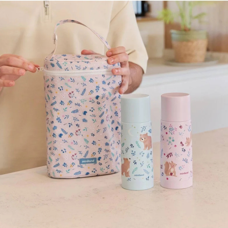 Termo para sólidos Miniland Squirrel (500ml) com 2 recipientes herméticos interiores. Mantém a temperatura dos alimentos por horas. Podes aquecer a comida diretamente nos recipientes. Livre de BPA. Ideal para levar refeições para a escola ou passeios.