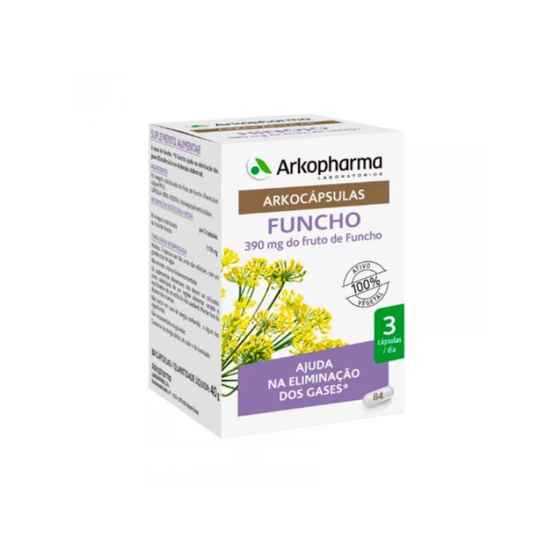 Arkocápsulas Funcho Cápsulas x84 é um suplemento alimentar à base de Funcho, ajuda na eliminação dos gases (flatulência) e na distensão abdominal.