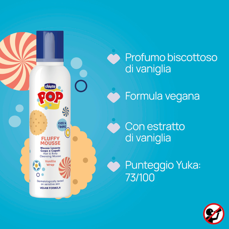 Parece chantilly, cheira a baunilha e limpa com suavidade - o Chicco POP Mousse de Banho cuida do corpo e do cabelo com uma nuvem de diversão!
