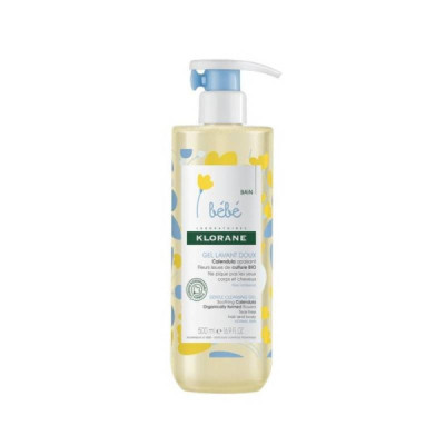 Klorane Bebé Gel de Limpeza Suave com Calêndula Calmante limpa, acalma e protege a pele e cabelo delicados dos bebés.