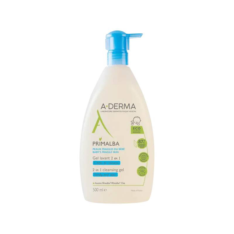 A-Derma Primalba Gel Corpo e Cabelo limpa suavemente o corpo e o cabelo dos bebés.