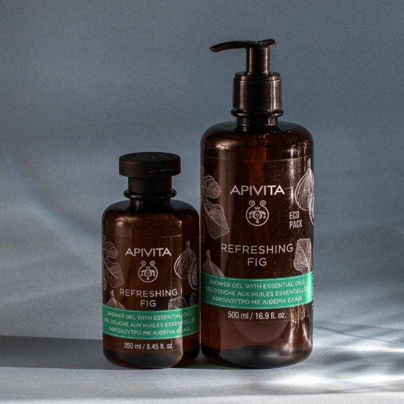 Gel de banho APIVITA Figo com 88% ingredientes naturais. Limpeza suave que mantém a hidratação da pele. Com figo, própolis, aloé vera, mel e óleos essenciais de lavanda e gerânio. Aroma refrescante e revitalizante. Para homem e mulher.