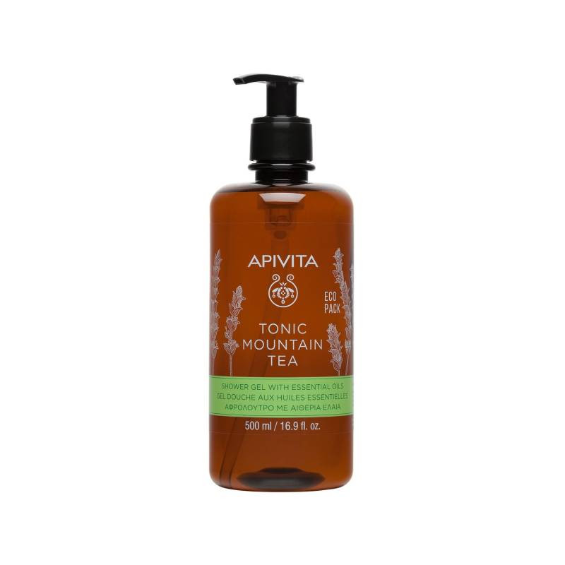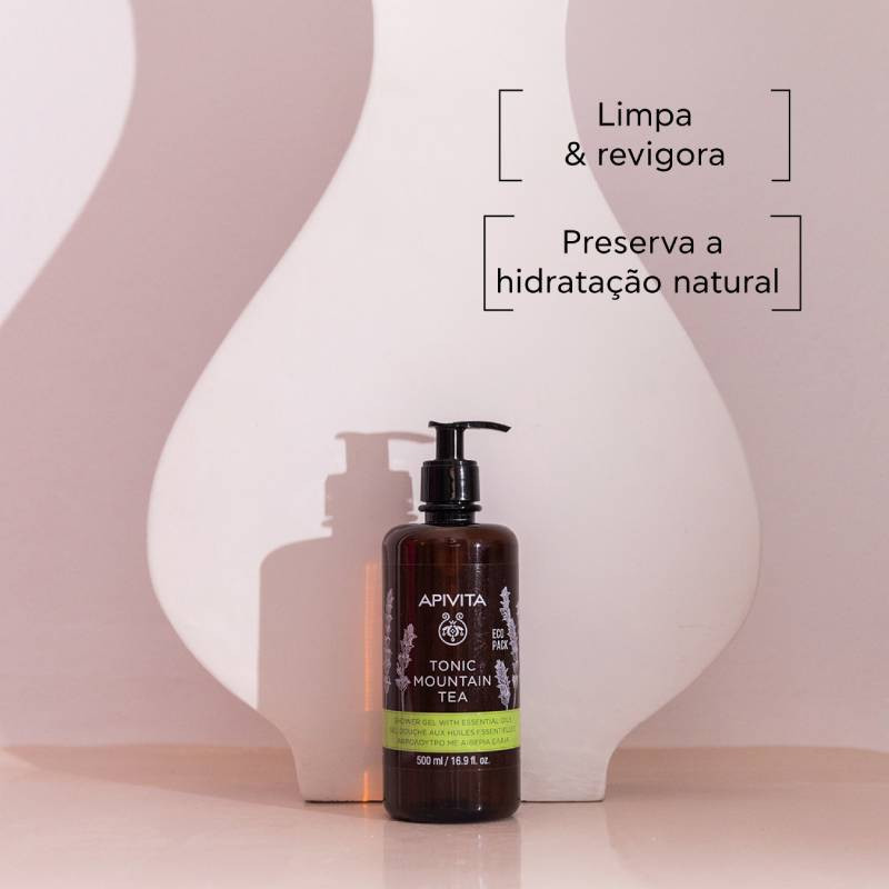 Apivita Gel De Banho Tonic Mountain Tea Ecopack 500ml mantém a hidratação natural da pele, graças a agentes de limpeza suaves e à saponária.