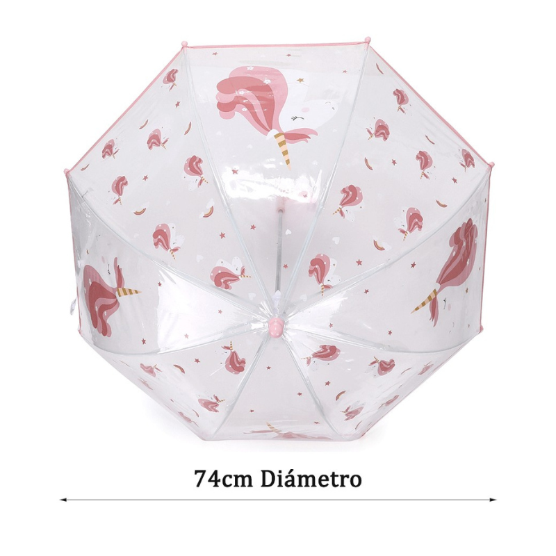 Guarda-chuva infantil transparente com ilustrações suaves e estrutura em fibra de vidro. Seguro, leve e perfeito para os dias de chuva!