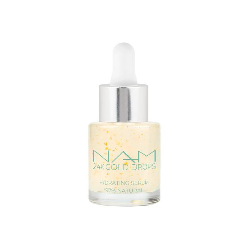 NAM Cosmetics 24K Gold Drops é um sérum facial com flocos de ouro de 24 quilates, ácido hialurónico e mais de 97% de ingredientes de origem natural, adequado para peles desidratadas.