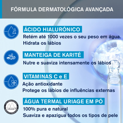 O Stick Hidratante Uriage foi desenvolvido para cuidar intensamente dos lábios secos, danificados ou expostos a agressões externas. Com 99,6% de ingredientes de origem natural, proporciona hidratação prolongada, reparação profunda e proteção antioxidante.