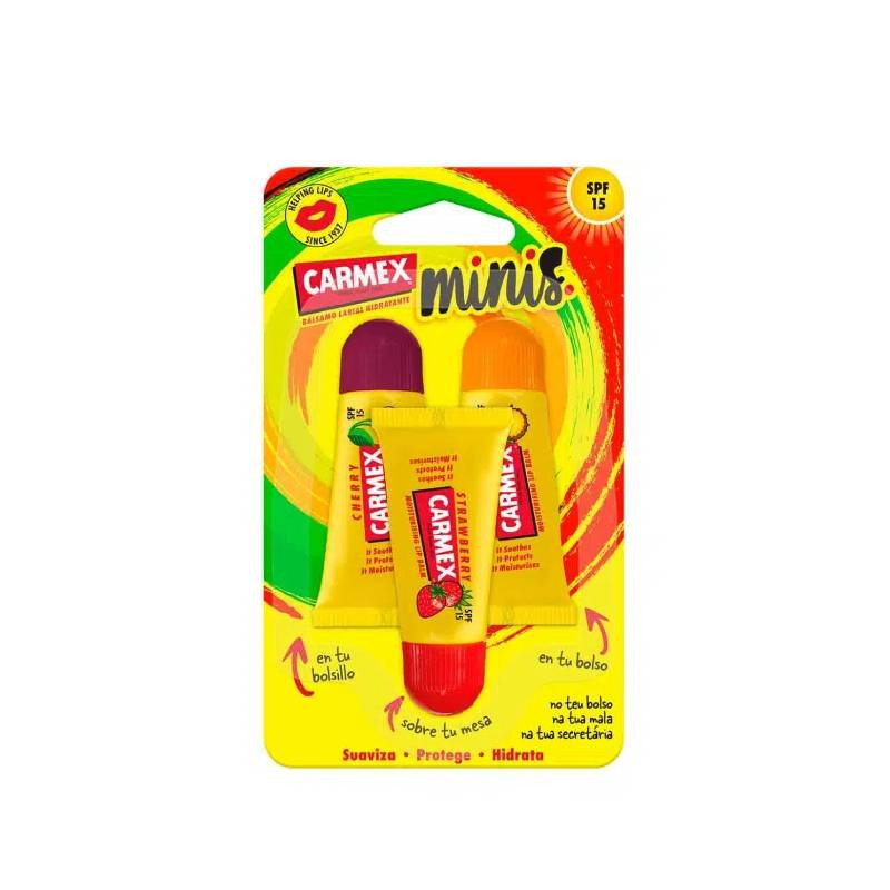 Carmex Minis Tubo Hidratante Labial SP15 3x5g é um pack de edição limitada que inclui 3 deliciosos sabores: morango, cereja e ananás.