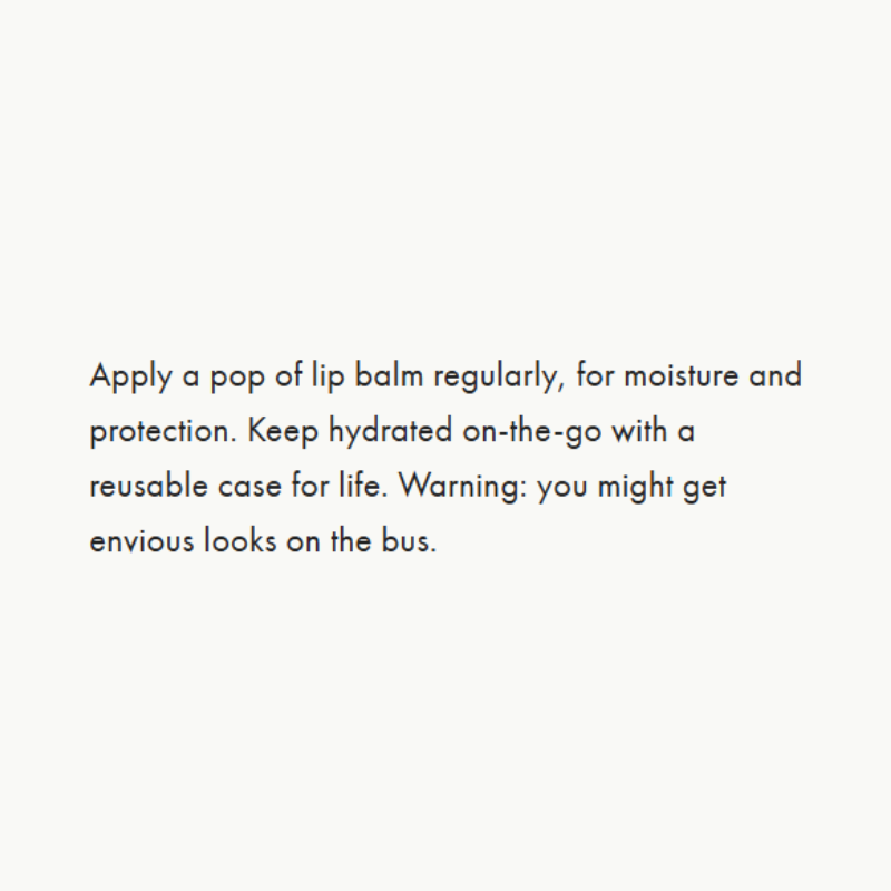 Com ingredientes como óleo de ameixa Kakadu e vitamina E, este bálsamo hidrata profundamente enquanto a case reutilizável te acompanha para sempre. Uma escolha consciente para lábios macios e um mundo mais verde!