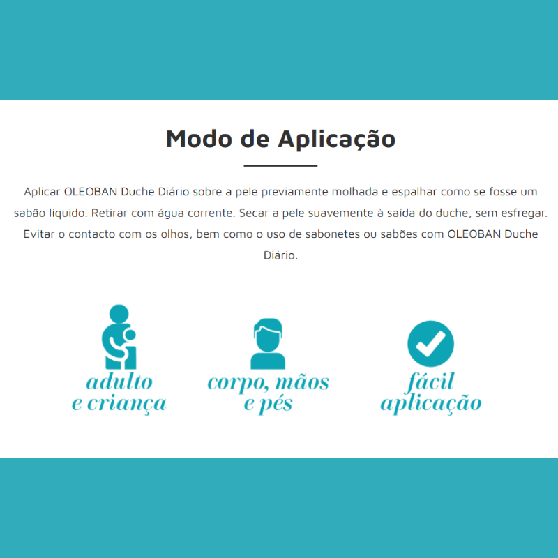 Aplicar sobre a pele previamente molhada e espalhar como se fosse um sabão líquido. Retirar com água corrente. Secar a pele suavemente à saída do duche, sem esfregar. Evitar o contacto com os olhos, bem como o uso de sabonetes ou sabões com OLEOBAN Duche Diário.