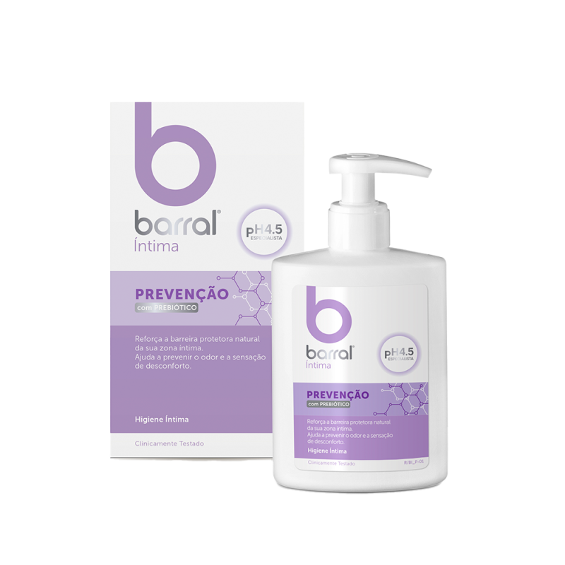 Barral Íntima Prevenção Com Prebiótico para a higiene íntima feminina, formulado com 4.5 e Prebiótico, protege e reforça a barreira protetora natural sem alterar a microbiota da zona íntima.