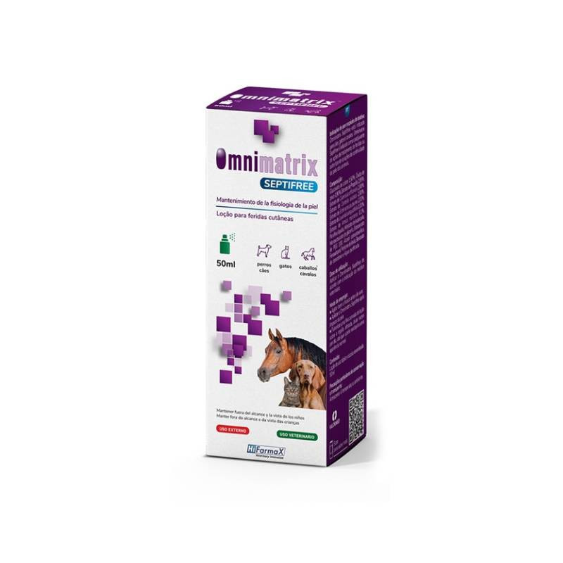 Omnimatrix Septifree Spray Loção Feridas 50ml é um cicatrizante que proporciona uma granulação rápida e equilibrada da ferida em cavalos, gatos e cães.