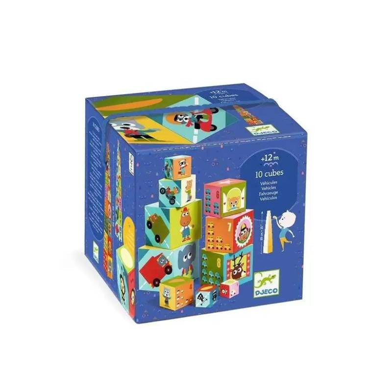 Djeco Jogo Blocos para Empilhar Veículos +12M é um jogo composto por 10 blocos feitos de cartão espesso, para bebés a partir dos 12 meses.