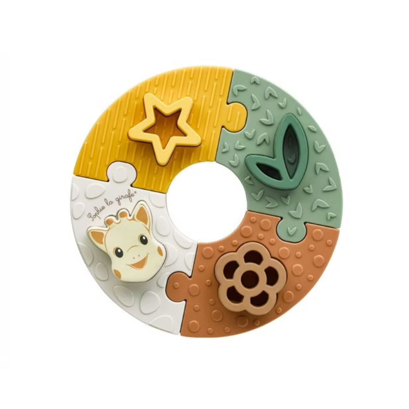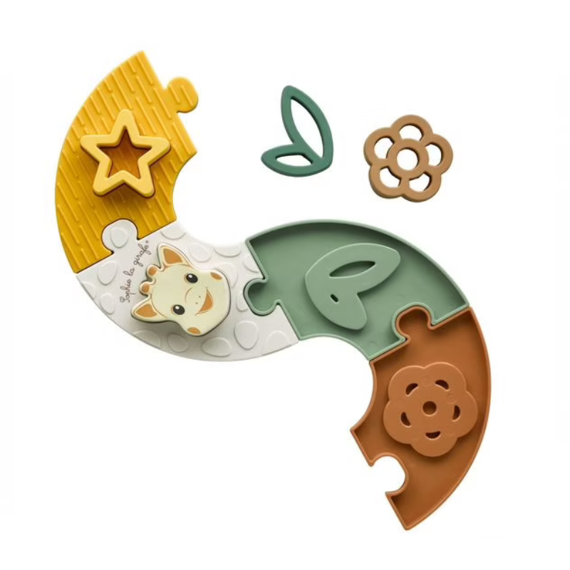 Puzzle sensorial Sophie la Girafe com 4 peças grandes e coloridas - ideal para estimular a motricidade fina, a lógica e a coordenação dos bebés a partir dos 10 meses.