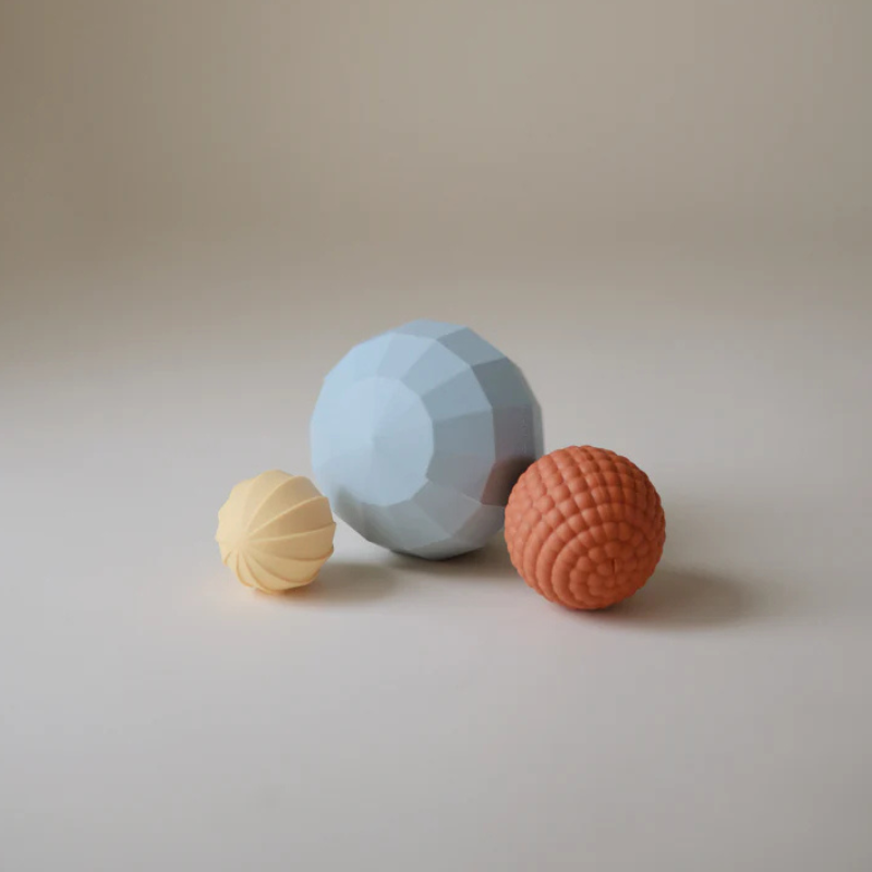 Conjunto de 3 esferas sensoriais de silicone na cor Powder Blue. Texturas variadas, som de chocalho e design em cápsula. Estimula sentidos e coordenação para bebés 10+ meses.
