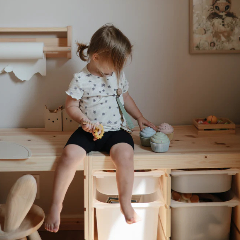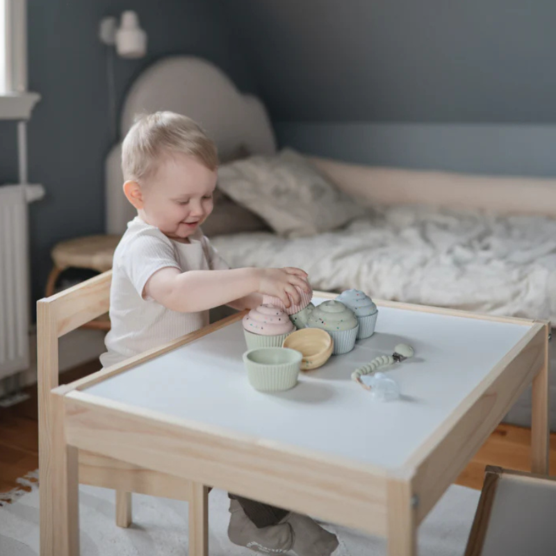 Adiciona uma dose de diversão e criatividade à hora da brincadeira! Os Cupcakes para Combinar da Mushie são um brinquedo tão doce quanto educativo. Cada um dos 4 cupcakes é composto por uma base de silicone macia e uma cobertura com sprinkles que se separam e unem facilmente. O teu pequeno chef pode criar combinações de cores, praticar o encaixe perfeito e dar asas à imaginação.