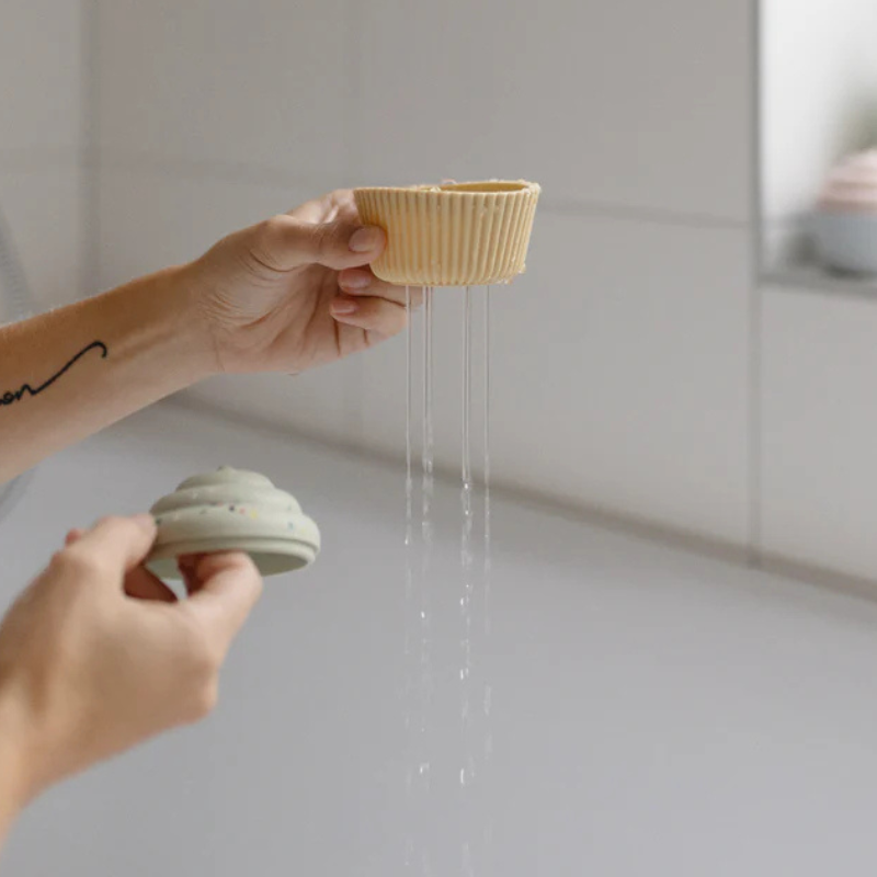 Conjunto de 4 cupcakes de silicone para combinar e separar. Cores vibrantes, base macia e cobertura com sprinkles. Desenvolve motricidade fina e criatividade a partir dos 10 meses.