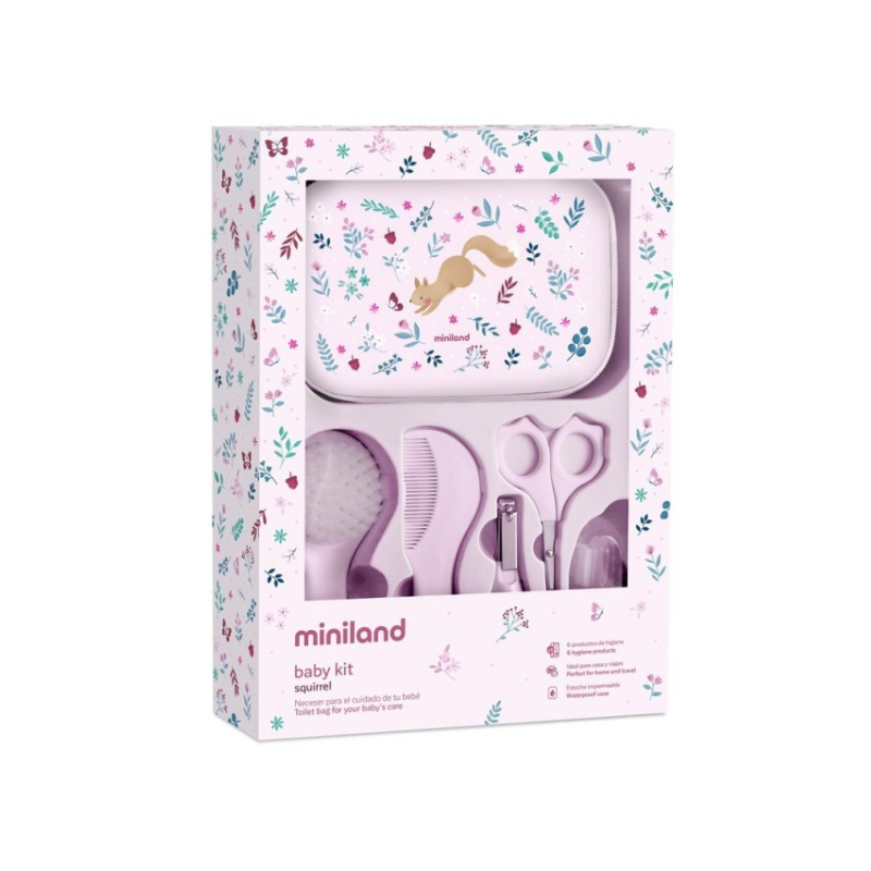 Kit de higiene Miniland para bebé com 6 acessórios: escova, pente, tesoura pontas redondas, corta-unhas, mordedor de silicone e 2 limas. Tudo numa prática bolsa de transporte. Ideal para casa e viagens. Presente perfeito.