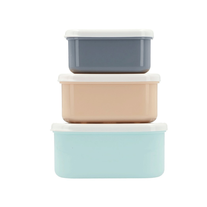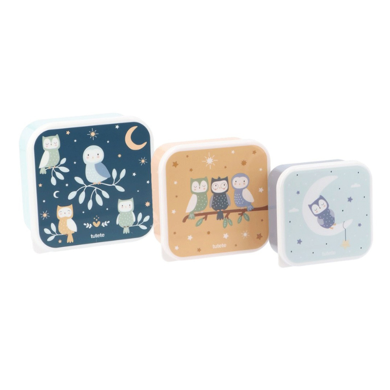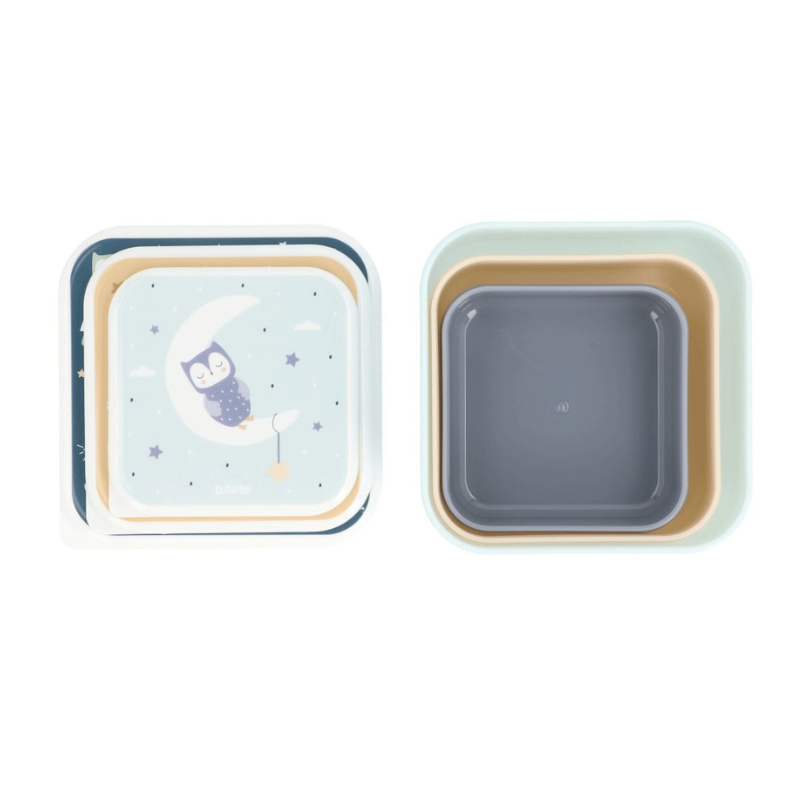 Conjunto de 3 caixas de lanche com tampas fáceis de abrir. Empilháveis, resistentes e ideais para levar snacks para a escola, passeios ou usar em casa.