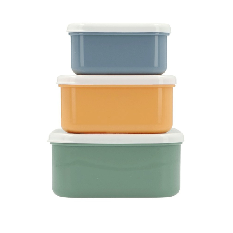 Conjunto de 3 caixas de lanche com tampas fáceis de abrir. Empilháveis, resistentes e ideais para levar snacks para a escola, passeios ou usar em casa.