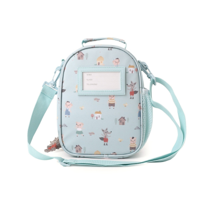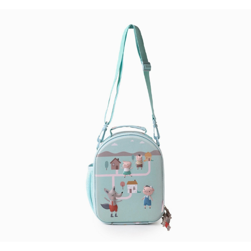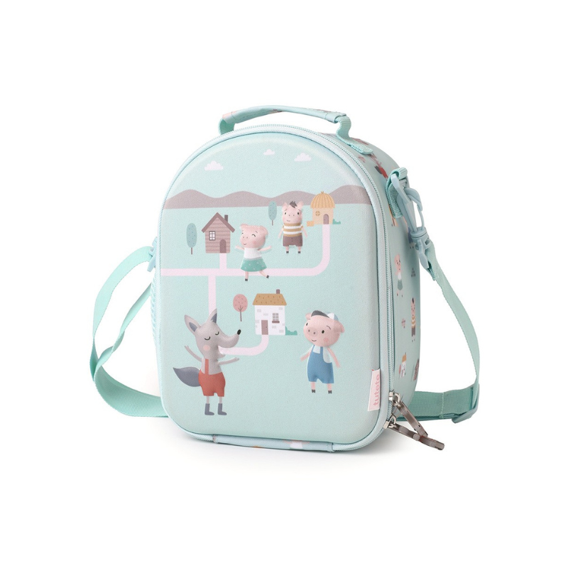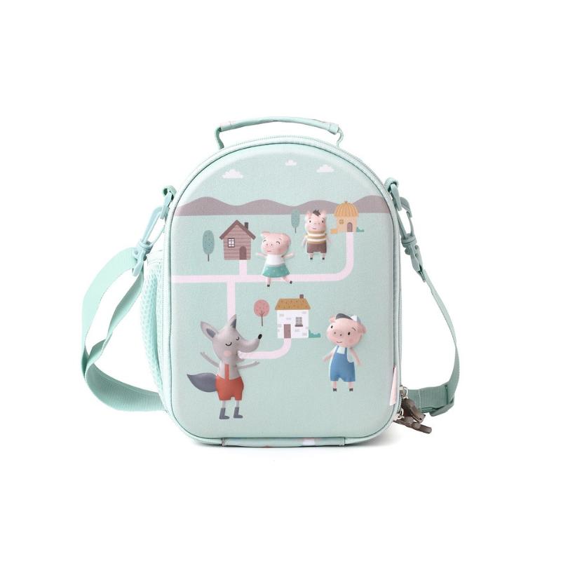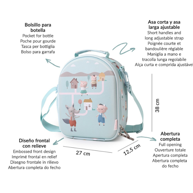 Tutete Bolsa Lanche Térmica 3D Três Porquinhos é prática, mantém os alimentos frescos e inclui bolso para garrafa, etiqueta personalizável e alça ajustável para maior conforto.